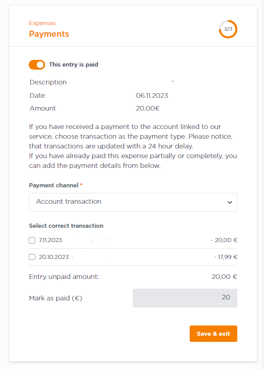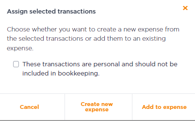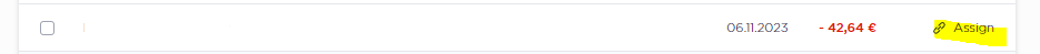 All account transactions made from your account can be found in the Account transactions section on the left-hand side of the menu. If you've already added the related expense to the service for a transaction, you can link it to a receipt by clicking the "Assign" button and selecting the "Add to Expense" option.