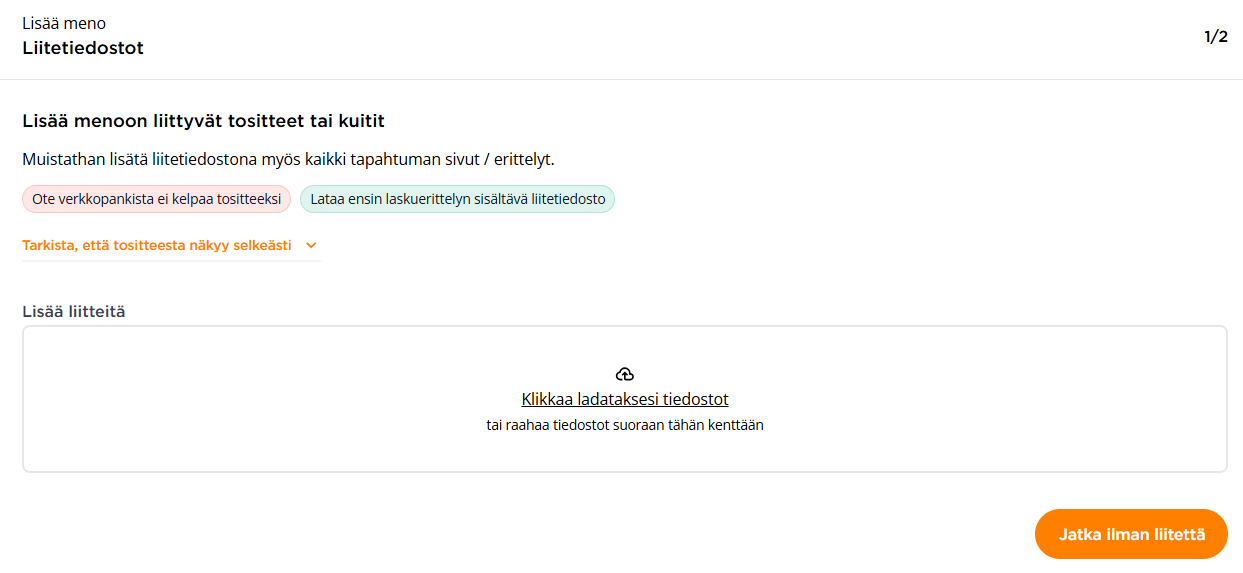 Tämän jälkeen pääset lisäämään tarvittavat tiedot ostoon liittyen. Voit lisätä ostoon liittyvän tositteen tai kuitin Liitetiedostot -osiosta. Huomioithan, että tiliote ei kelpaa tositteeksi (poikkeuksena pankin perimät palvelumaksut).