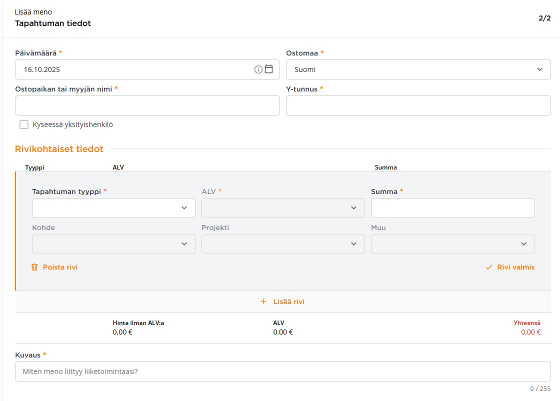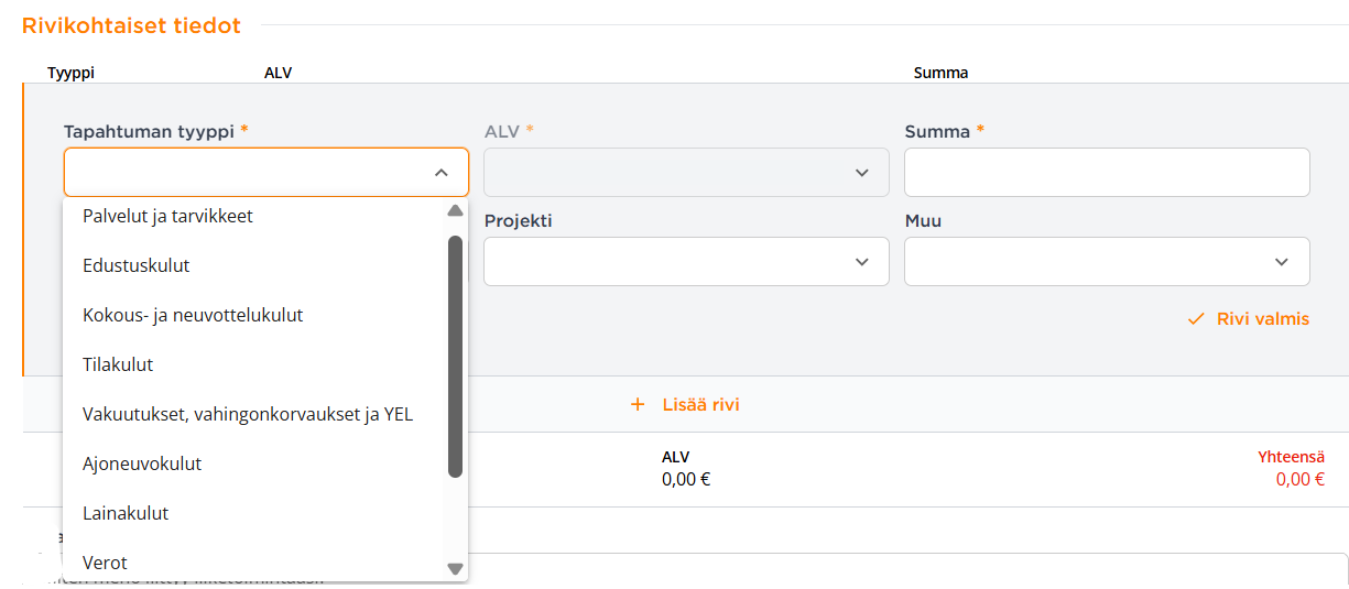 Rivikohtaisissa tiedoissa pääset valitsemaan kululle tarkemman tapahtuma tyypin. Jos haluat eritellä hankintaa tarkemmin, voit lisätä rivejä "lisää rivi'' -kohdasta ja alasvetovalikosta voit valita mihin tyyppiin lisäämäsi meno/rivi liittyy. Voit lukea yksityiskohtaiset ohjeet eri menotyyppien lisäyksestä tämän sivun lopusta