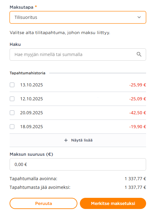 Mikäli lisäät oston (menon) palveluumme, mitä et ole vielä maksanut, tulee sinun lisätä maksumerkintä vasta myöhemmin, kun maksu on maksettu ja se näkyy yrityksesi tilitapahtumissa.