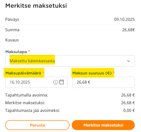 Mikäli hankinta on maksettu käteisellä, valitse maksutiedoissa "maksettu käteiskassasta", kerro todellinen maksupäivämäärä, tarkista että maksun suuruus on oikein ja merkitse meno maksetuksi.